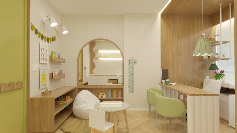 A sala de atendimento foi pensada para convidar e não assustar. Usamos as cores da marca, madeira em freijó, texturas suaves e formas arredondadas que trazem fluidez e acolhimento. A parte técnica está toda ali — maca, cuba de lavatório, área de pesagem e espaço para troca de fraldas — mas integrada com delicadeza, sem que o aspecto clínico sobreponha o cuidado.